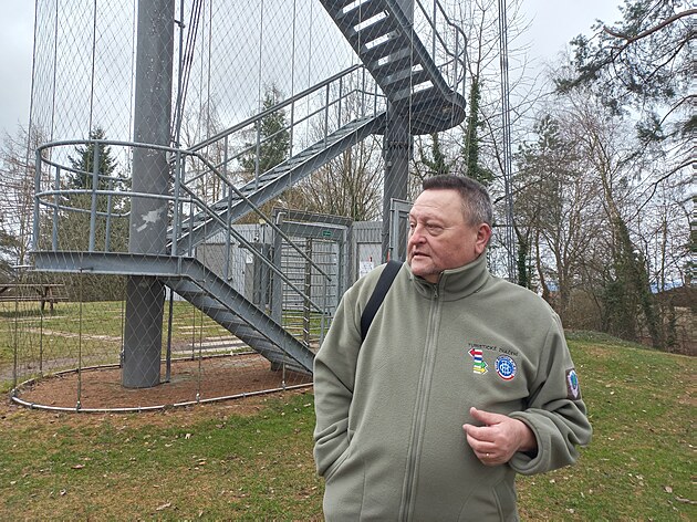 Předseda Rady značení Klubu českých turistů Pavel Přílepek z Tábora na rozhledně Hýlačce