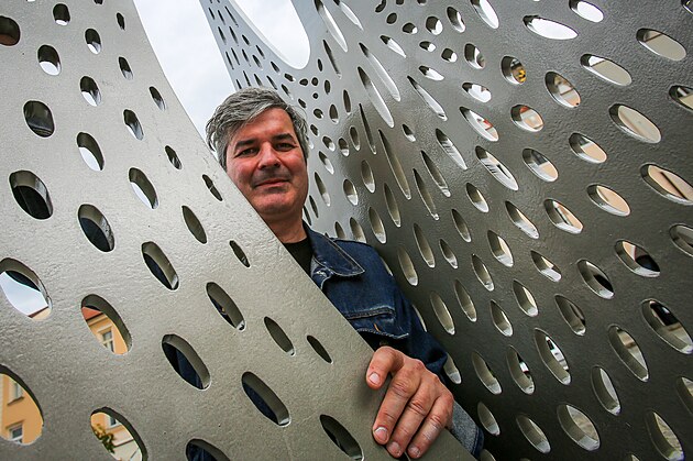 V jednom z rohů českobudějovického náměstí Přemysla Otakara II. stojí ocelová socha s názvem Maska (Persona). Vytvořil ji Michal Cimala (na snímku) a nabízí zajímavé pohledy na známé místo skrz desítky dírek.