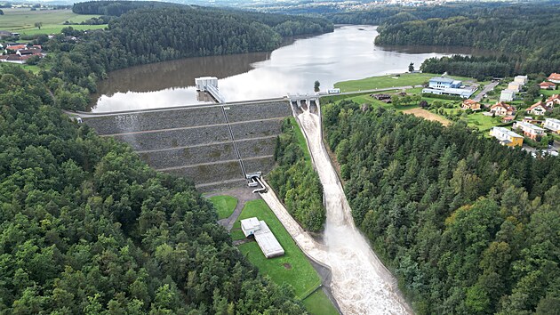 Takto vypadalo na maximum naplněné vodní dílo Římov 17. září letošního roku. Pod hrází je takzvaný přejímací objekt JVS, odkud surová voda teče sedmikilometrovým podzemním přivaděčem na úpravnu Plav. Tam se mění na pitnou.