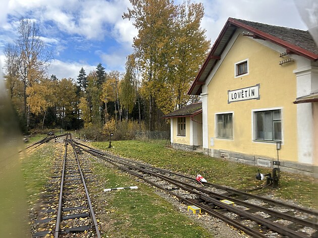 Jedna ze stanic na trase úzkokolejky. Okna vagonů se mlžila. (říjen 2025)