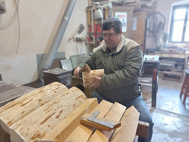 Václav Dejmek vyrábí ve své dílně v Malenicích hrkačky, ale také násady na sekyry, palice nebo prkénka pod myslivecké trofeje.