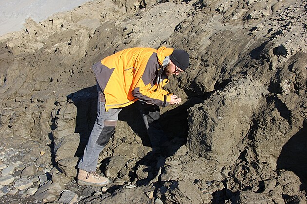 Jan Kavan zkoumá čerstvě odledněné pobřeží před ledovcem Nathorstbreen (jihozápadní Svalbard).
