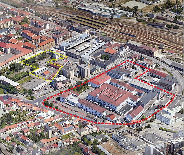 Na vizualizaci je vidět celá rozvojová lokalita. Červeně ohraničená je oblast Viscofanu. Zeleně bývalá kasárna. (představení projektu září 2025)