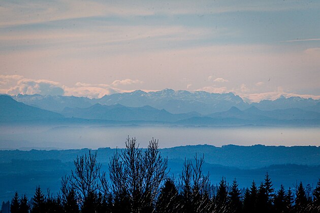 Výletníky odmění výhled na reliéf rakouských Alp vykukující mezi stromy.