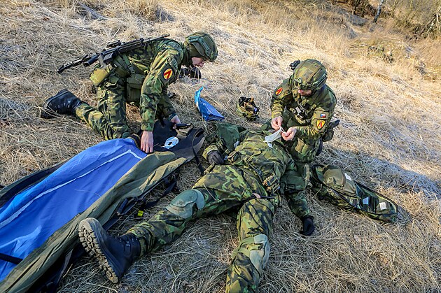 Jeden z vojáků raněného ošetřuje, druhý pak už rozbaluje nosítka na přenos.