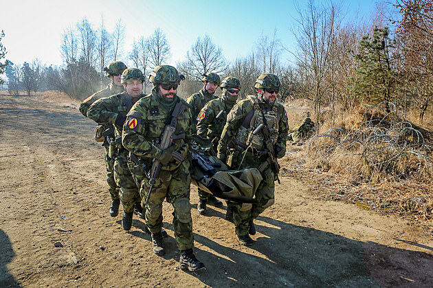 Šestice mužů nese raněného dál do bezpečí.