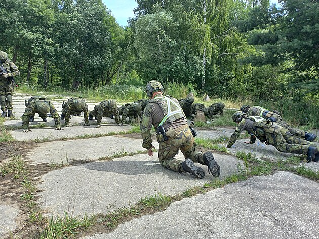 Útvar 25. protiletadlového raketového pluku ze Strakonic připravil pro středoškoláky měsíční cvičení. Na snímku z Boletic mají střelecko taktickou přípravu. Jeden z členů týmu ztratil při akci zásobník, za což následoval trest pro všechny – kliky.