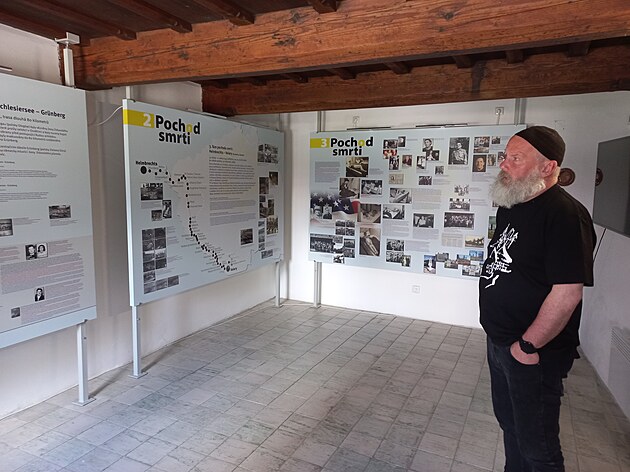 Jaroslav Pulkrábek popisuje jednotlivé informační tabule k pochodu smrti, které jsou k vidění ve volarském muzeu.