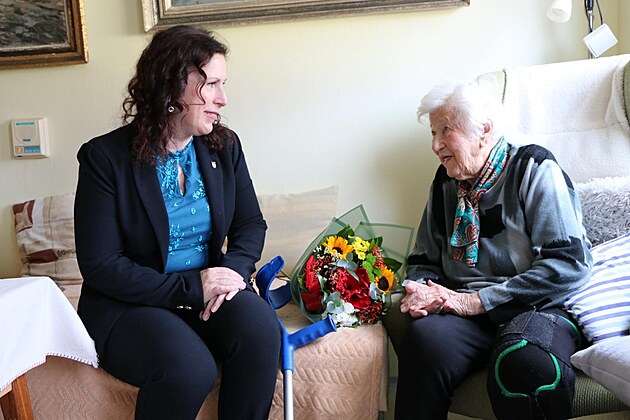 Blažena Strachotová při oslavě narozenin, letos ji bylo 108 let. Byla to optimistická a půvabná dáma, velmi soběstačná a také oblíbená. Na snímku je s primátorkou Budějovic Dagmar Škodovou Parmovou.