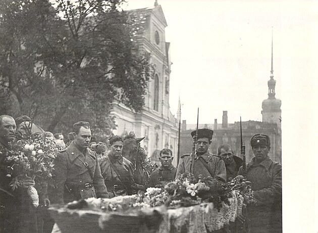 Pohřeb padlého sovětského vojáka na Moravském náměstí v Brně (duben 1945)