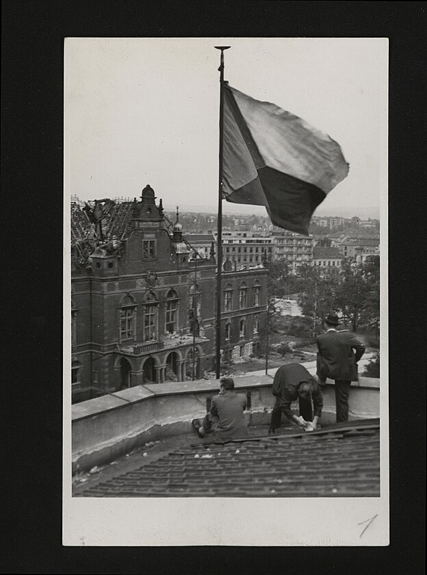 Československá vlajka na tehdejším Německém domě v místech dnešního Moravského náměstí v Brně.