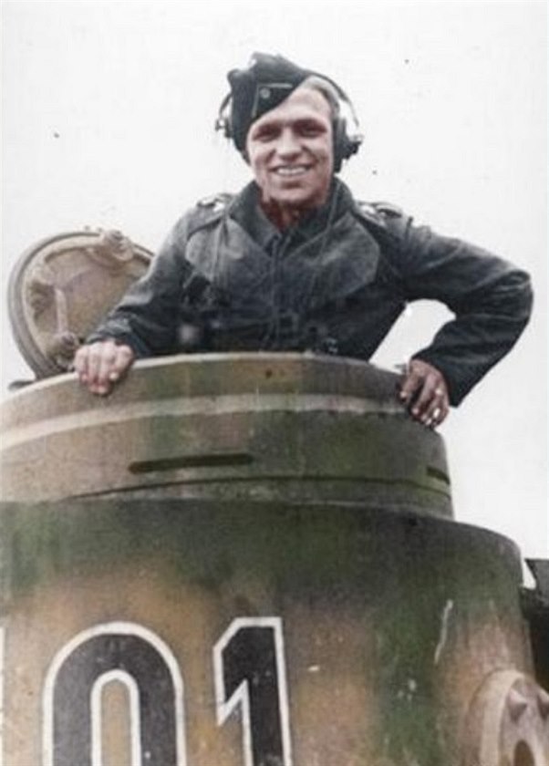 Kurt Knispel ve velitelském poklopu tanku PzKpfw VI Tiger; stroj je dobře rozeznatelný podle kruhové věže.
