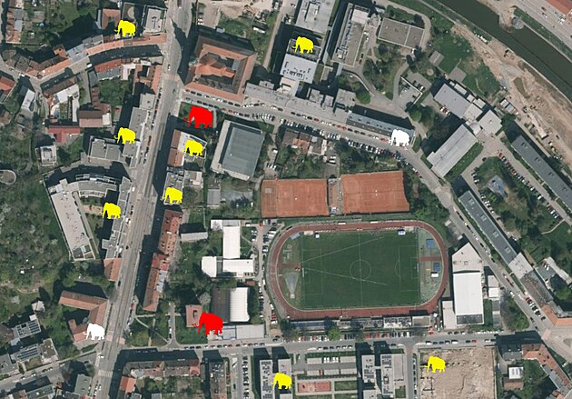 Výřez z letecké mapy s vyznačením nejvýznamnějších míst s nálezy posledních lovců mamutů v Brně-Štýřicích. Červený mamut vyznačuje místa letošních objevů, žlutý mamut místa starších nálezů pleistocenních kostí doprovázených kamennými nástroji, bílý mamut označuje místa pouze s nálezy kamenných nástrojů.