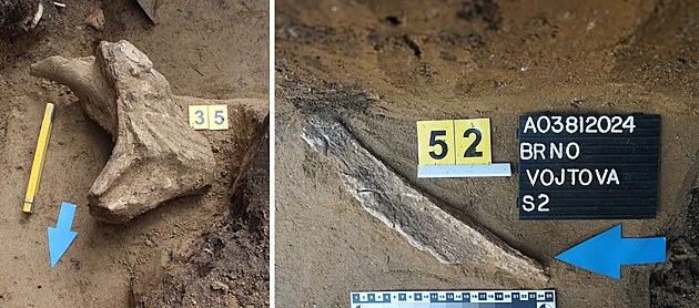 Mamutí kosti, už nachystané, aby mohly být odebrány do sádrového bloku k další laboratorní preparaci.