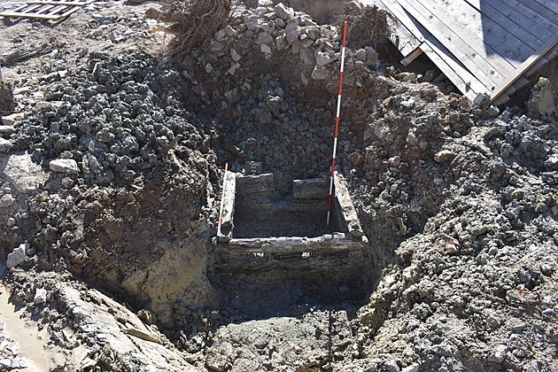 Archeologové pod náměstím v Tišnově na Brněnsku objevili dřevěné potrubí tvořené kmeny, které se napojují do servisní šachty. (září 2025)