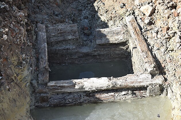 Archeologové pod náměstím v Tišnově na Brněnsku objevili dřevěné potrubí tvořené kmeny, které se napojují do servisní šachty. (září 2025)