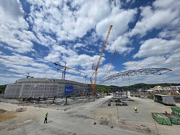 Na multifunkční arénu, která roste na brněnském výstavišti, usadil obří jeřáb ocelovou střešní konstrukci. (12. května 2025)