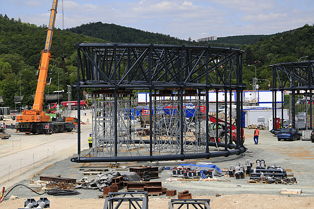 Na multifunkční arénu, která roste na brněnském výstavišti, usadil obří jeřáb ocelovou střešní konstrukci. (12. května 2025)