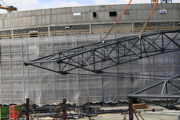 Na multifunkční arénu, která roste na brněnském výstavišti, usadil obří jeřáb ocelovou střešní konstrukci. (12. května 2025)