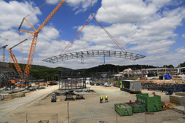 Na multifunkční arénu, která roste na brněnském výstavišti, usadil obří jeřáb ocelovou střešní konstrukci. (12. května 2025)