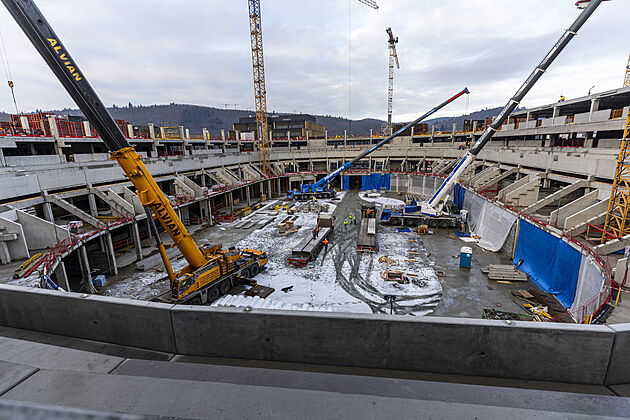 Stavba multifunkční arény v Brně pokračuje, na začátku roku 2025 je ve zhruba dvouměsíčním skluzu oproti harmonogramu. (16. ledna 2025)