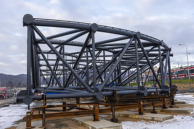 Stavba multifunkční arény v Brně pokračuje, na začátku roku 2025 je ve zhruba dvouměsíčním skluzu oproti harmonogramu. Na snímku střešní konstrukce, připravená k osazení. (16. ledna 2025)
