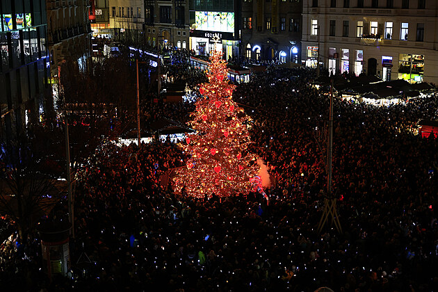Rozsvícený vánoční strom na brněnském náměstí Svobody (listopad 2024)