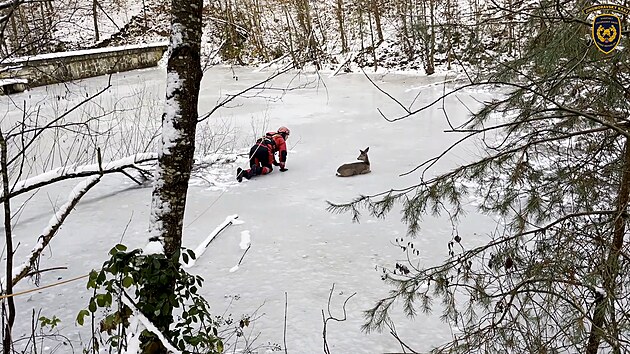 Hasič se vydal pro srnčí mládě uvázlé na ledu