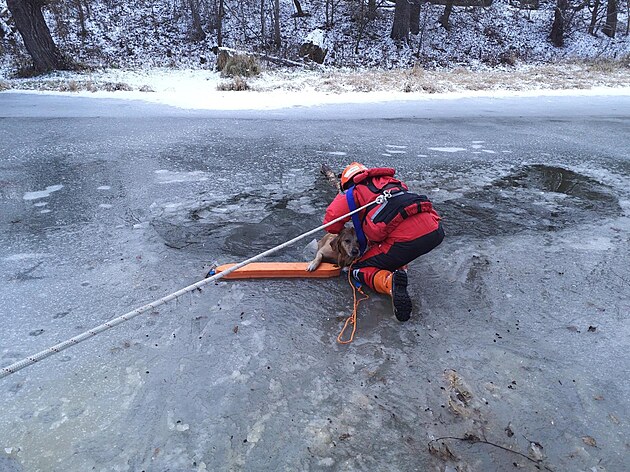 Hasiči zachránili dva psy, kteří se propadli ledem do řeky Oslavy poblíž Ivančic na Brněnsku. (15. ledna 2025)