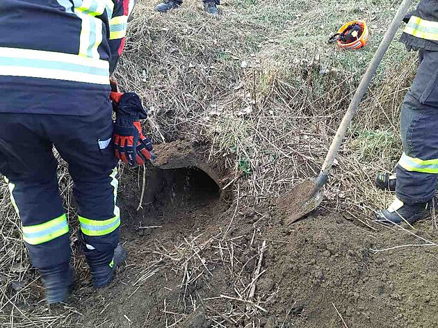 Hasiči na Kyjovsku zachránili ze zasypané železobetonové roury uvězněného psa.