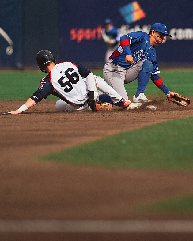 Momentka ze zápasu českých baseballistů na mistrovství Evropy 2025 v Rotterdamu