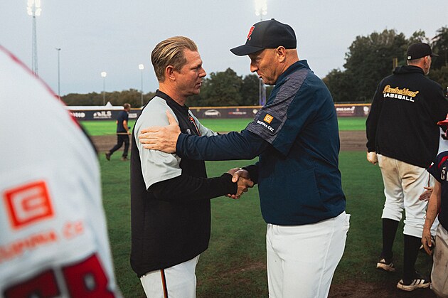 Trenér českých baseballistů Pavel Chadim (vpravo) se před zápasem na ME 2025 v Rotterdamu zdraví se svým německým protějškem.