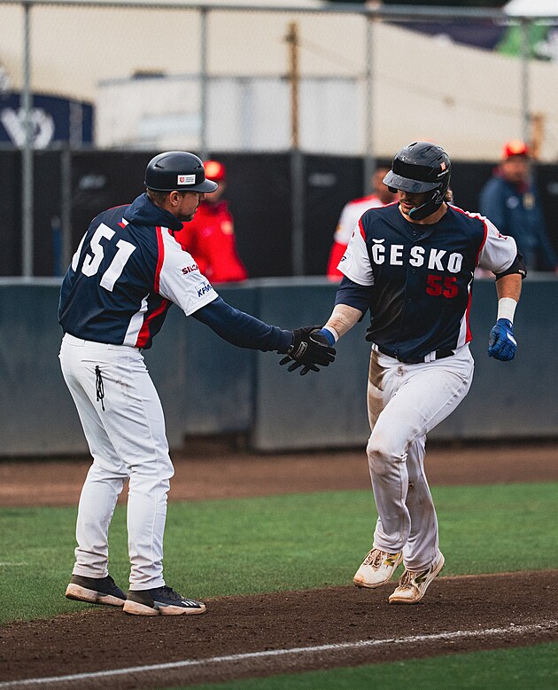 Baseballový trenér Petr Stříbrcký (vlevo) během mistrovství Evropy 2025 v Rotterdamu. U reprezentace působil jako asistent a kouč běžců na metách.