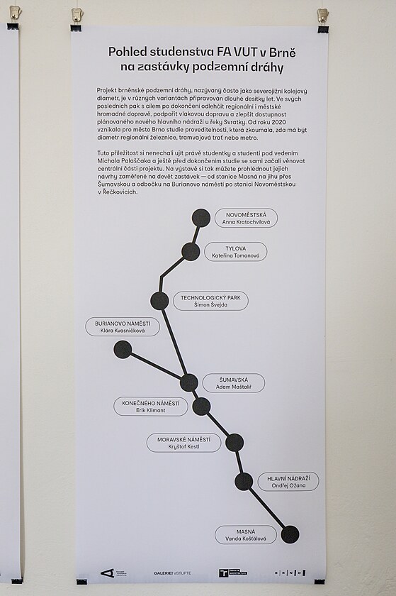 Návrhy budoucích zastávek brněnské podzemní dráhy v podání studentů z Fakulty architektury VUT vystavuje KAM Brno na Zelném trhu. (září 2025)