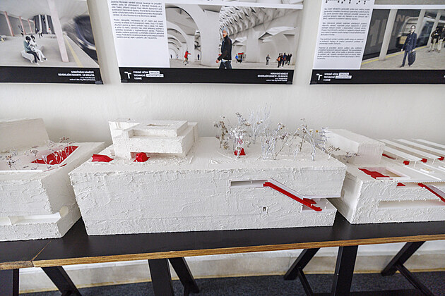 Návrhy budoucích zastávek brněnské podzemní dráhy v podání studentů z Fakulty architektury VUT vystavuje KAM Brno na Zelném trhu. (září 2025)