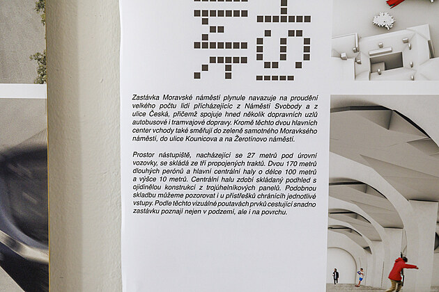 Návrhy budoucích zastávek brněnské podzemní dráhy v podání studentů z Fakulty architektury VUT vystavuje KAM Brno na Zelném trhu. (září 2025)