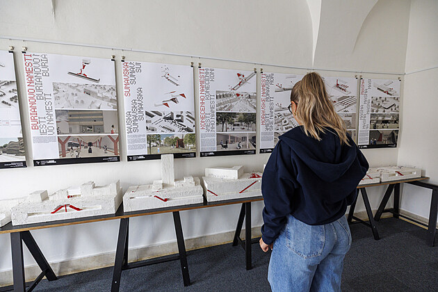 Návrhy budoucích zastávek brněnské podzemní dráhy v podání studentů z Fakulty architektury VUT vystavuje KAM Brno na Zelném trhu. (září 2025)