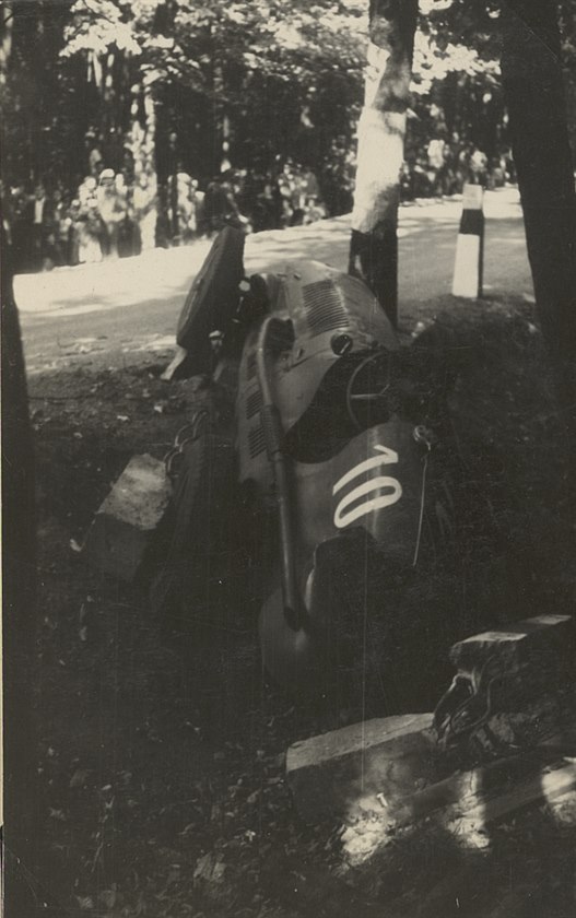 Zdemolované maserati prince Biry ve Farinově zatáčce. Jezdec havaroval v druhém kole.