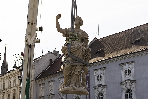 Na kašnu Parnas na Zelném trhu v Brně se vrátila alegorická socha Evropy. Originál z vápence vystřídala replika z umělého kamene. (14. května 2025)