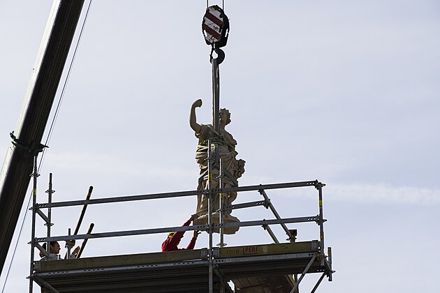 Na kašnu Parnas na Zelném trhu v Brně se vrátila alegorická socha Evropy. Originál z vápence vystřídala replika z umělého kamene. (14. května 2025)
