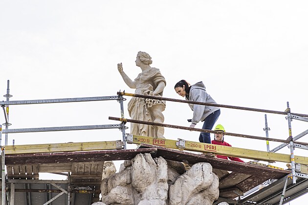 Na kašnu Parnas na Zelném trhu v Brně se vrátila alegorická socha Evropy. Originál z vápence vystřídala replika z umělého kamene. (14. května 2025)