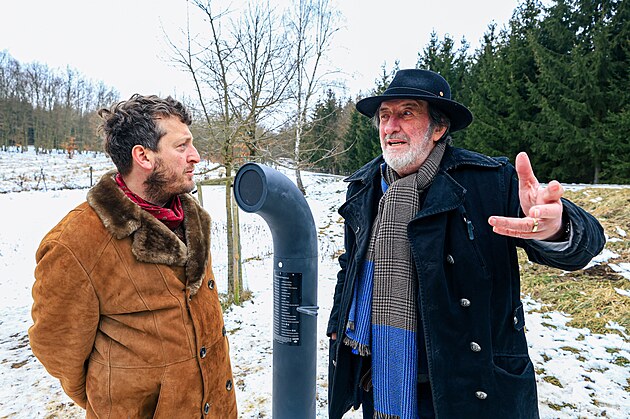 Herec Boleslav Polívka odhalil u Ríšovy studánky v Podkomorských lesích na okraji Brna nový poesiomat. Oživí vzpomínku na román Viléma Mrštíka Pohádka máje, který se odehrává v okolní lesní krajině. Na snímku vlevo je autor projektu a zakladatel spolku Piána na ulici Ondřej Kobza. (21. února 2025)
