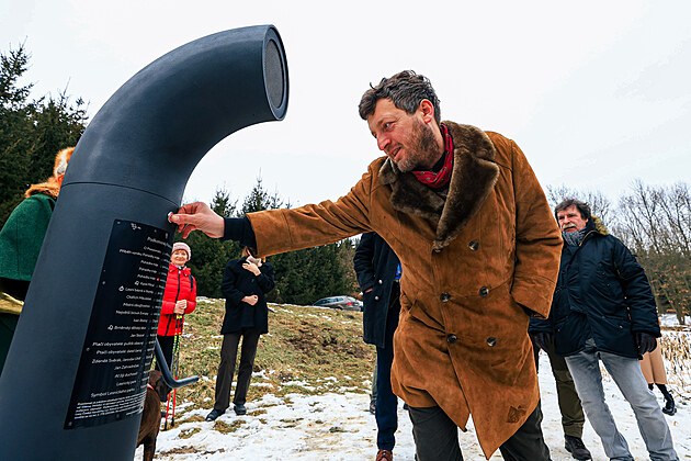 V pátek odpoledne se uskutečnilo slavnostní odhalení nového poesiomatu u Ríšovy studánky v Podkomorských lesích na okraji Brna. Na snímku je autor projektu a zakladatel spolku Piána na ulici Ondřej Kobza. (21. února 2025)