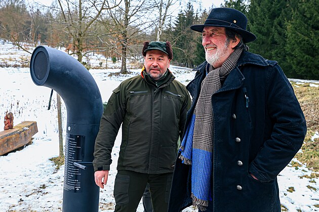Herec Boleslav Polívka odhalil u Ríšovy studánky v Podkomorských lesích na okraji Brna nový poesiomat. Oživí vzpomínku na román Viléma Mrštíka Pohádka máje, který se odehrává v okolní lesní krajině. Na snímku je společně s generálním ředitelem Lesů ČR Daliborem Šafaříkem. (21. února 2025)