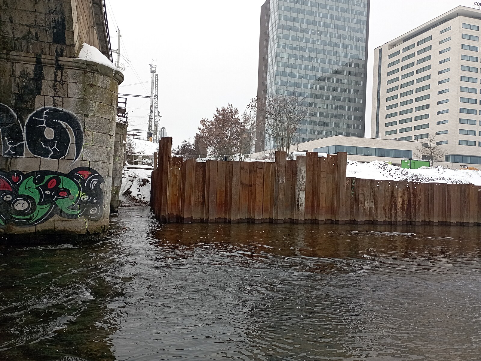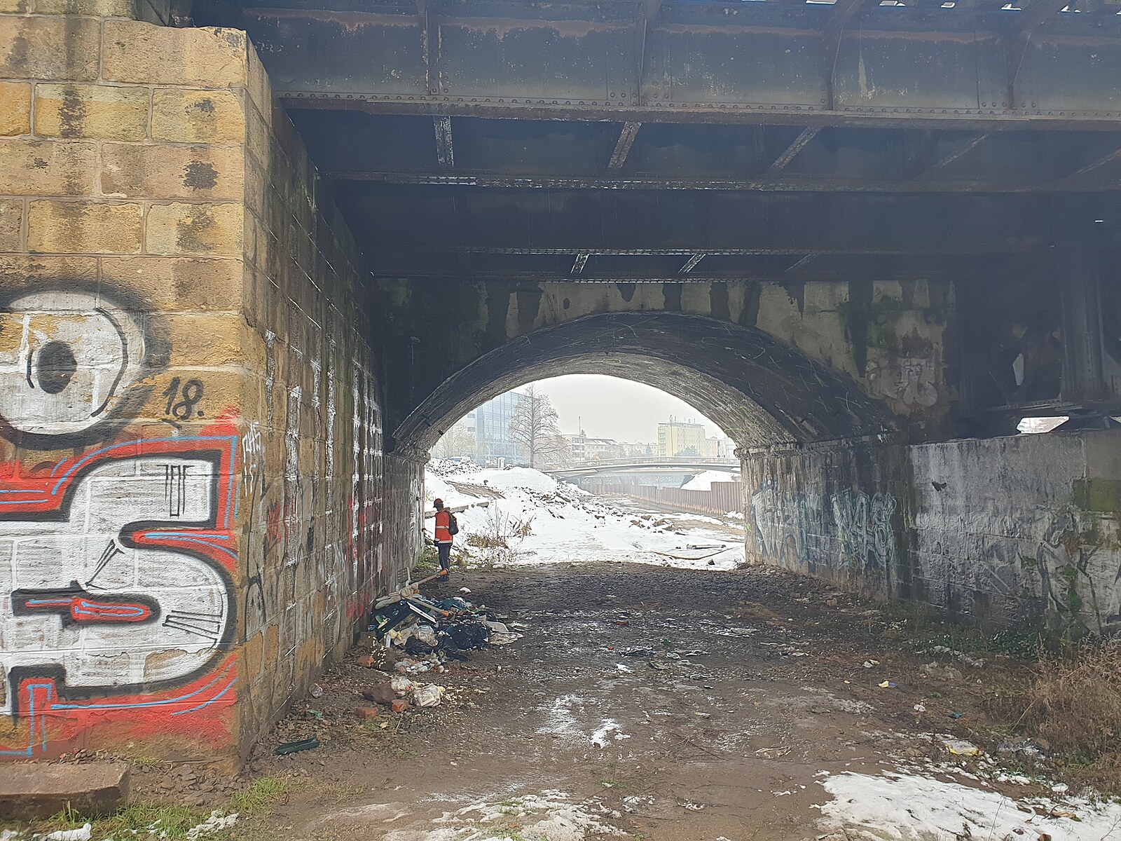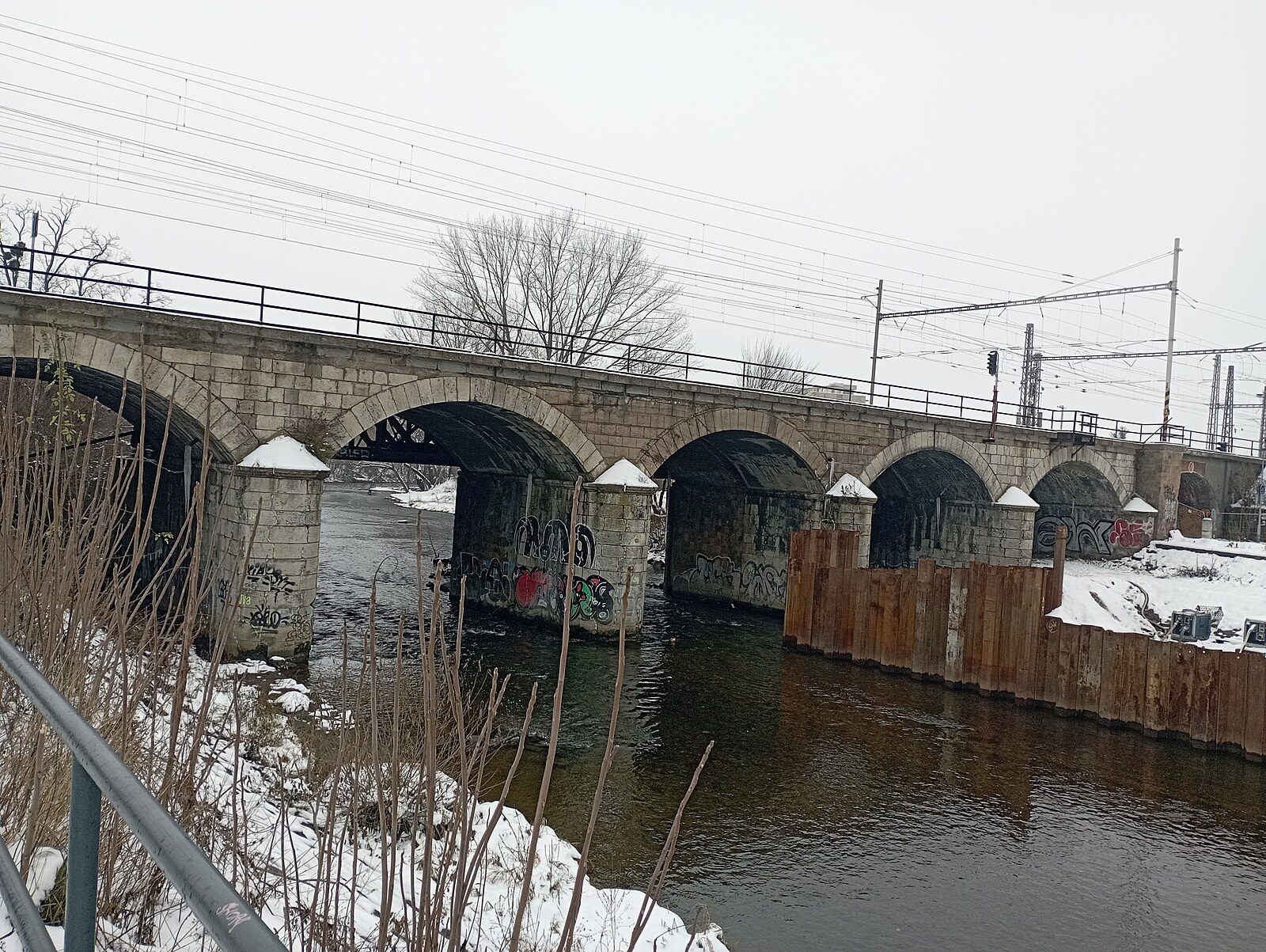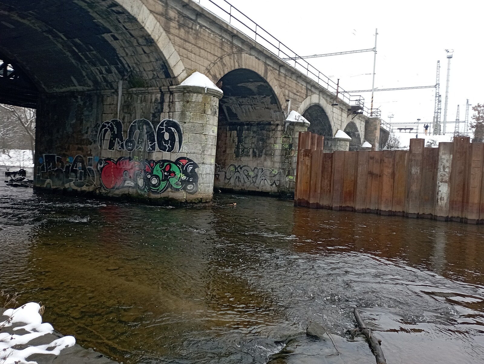 Poškozený pilíř železničního mostu nedaleko hlavního nádraží v Brně. V jeho blízkosti Brno buduje protipovodňová opatření.