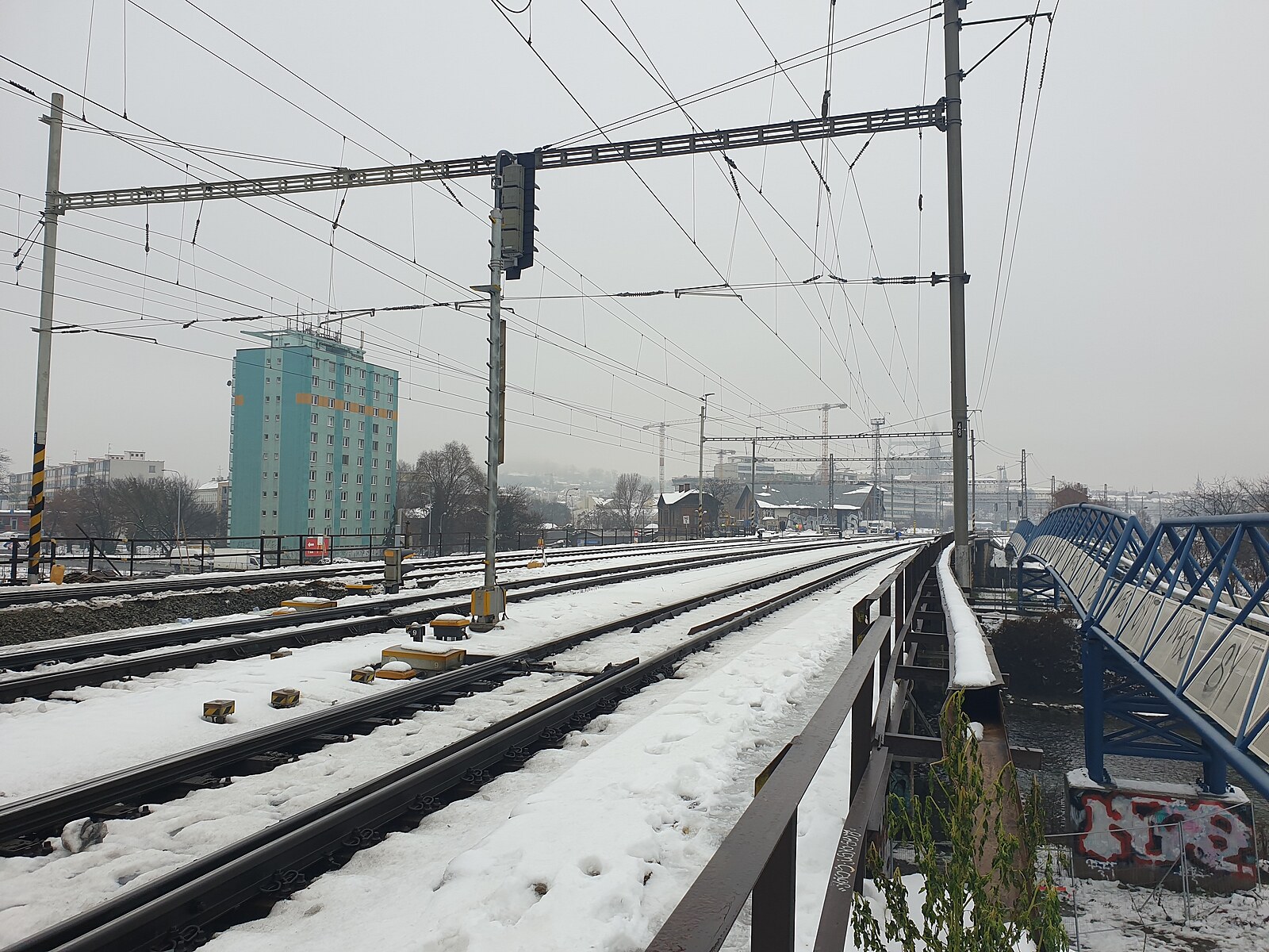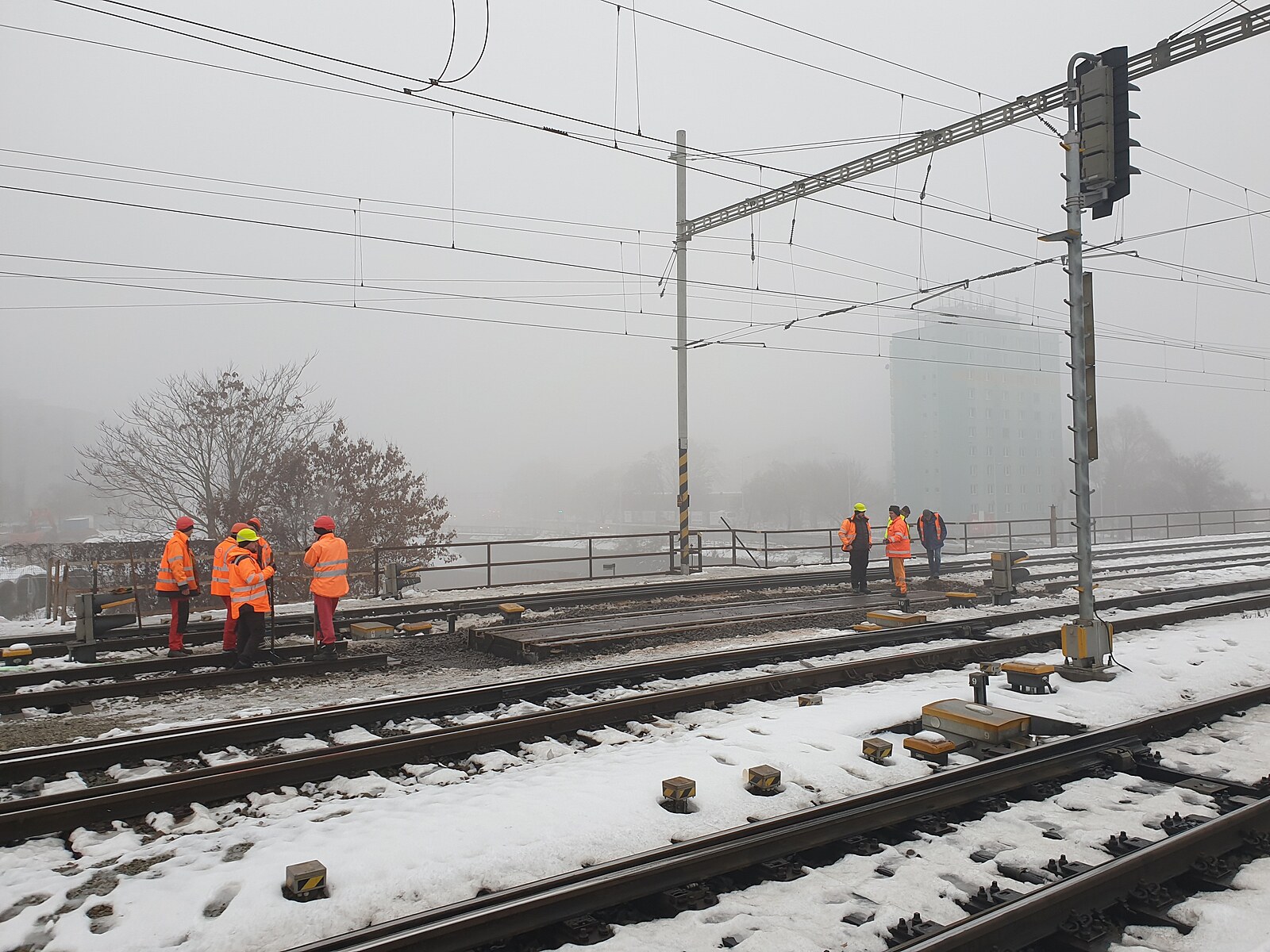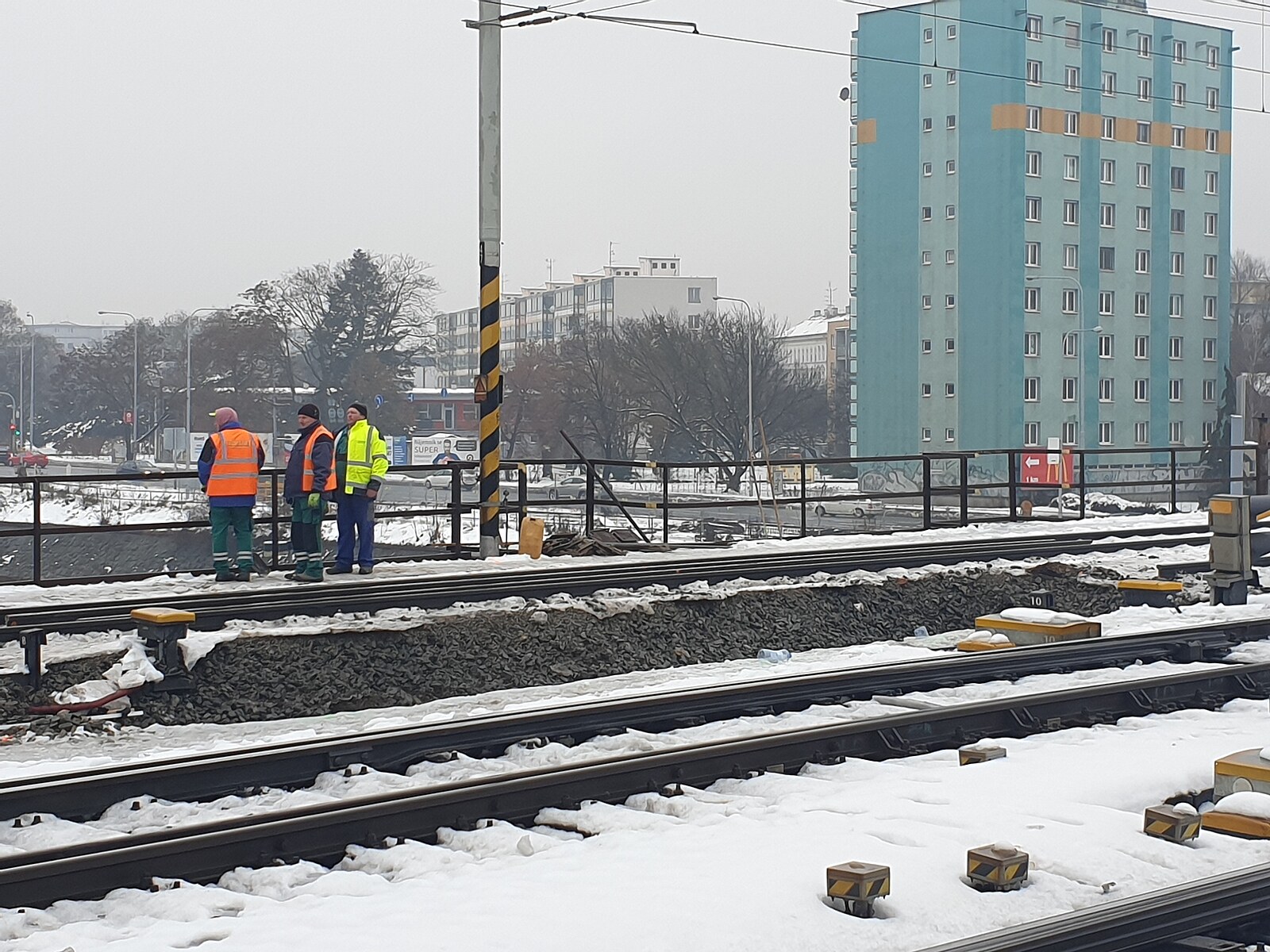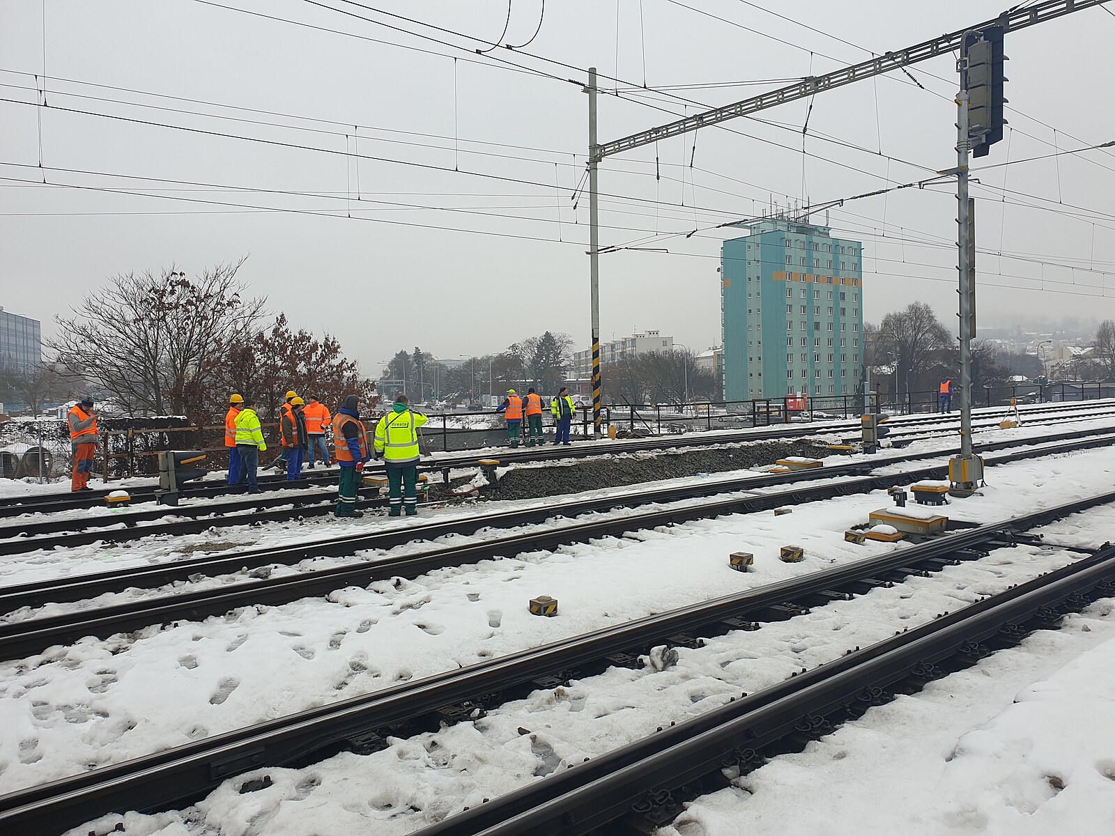 Poškozený železniční most v Brně, na němž dělníci usilovně pracují. (23. prosince 2022)