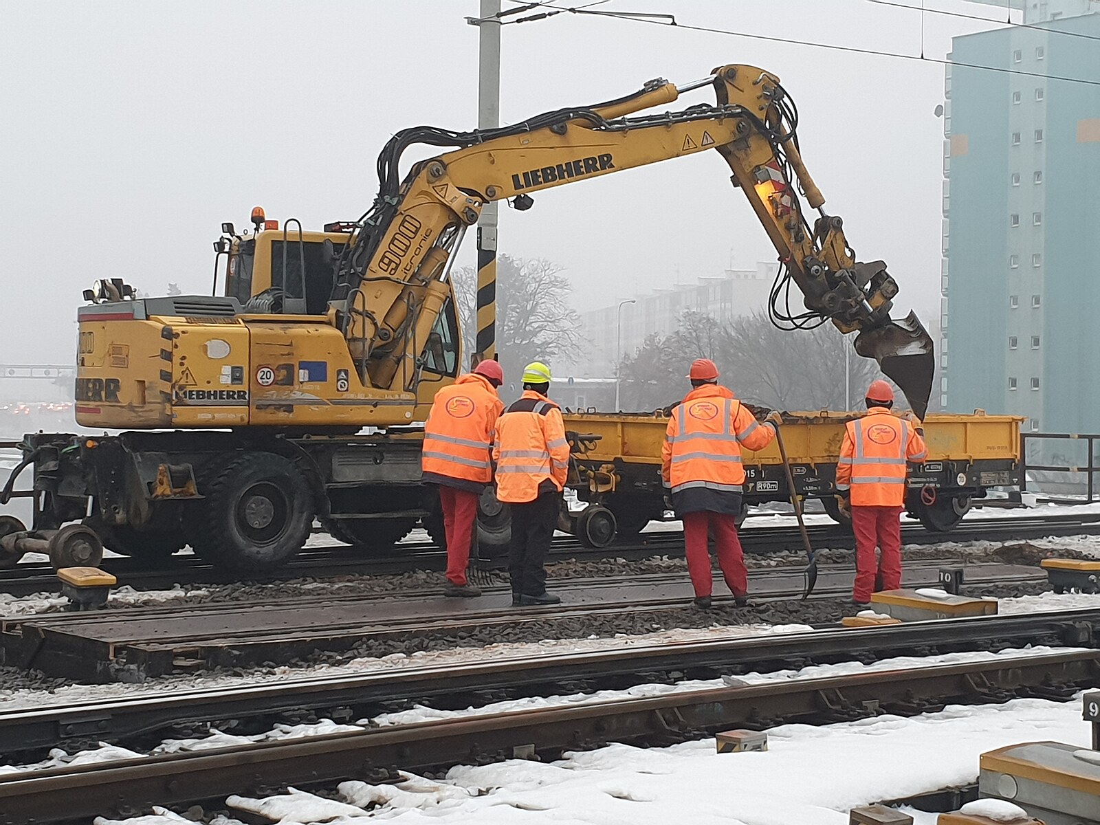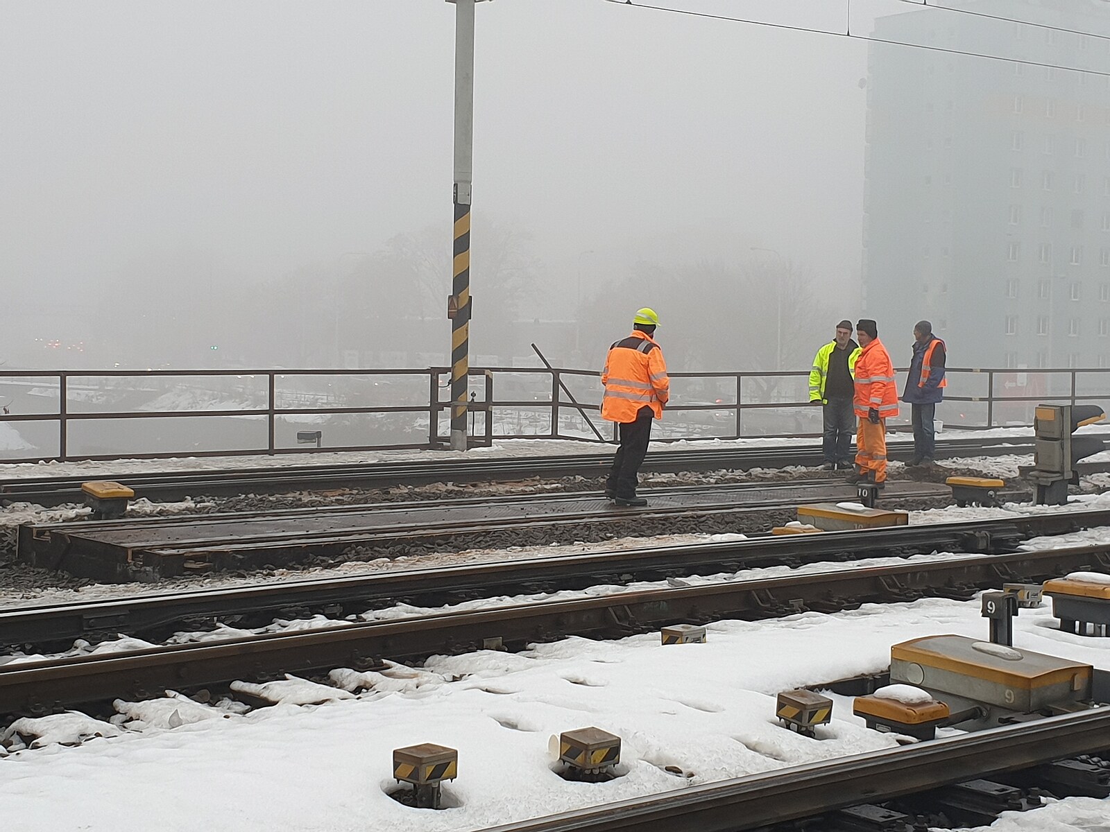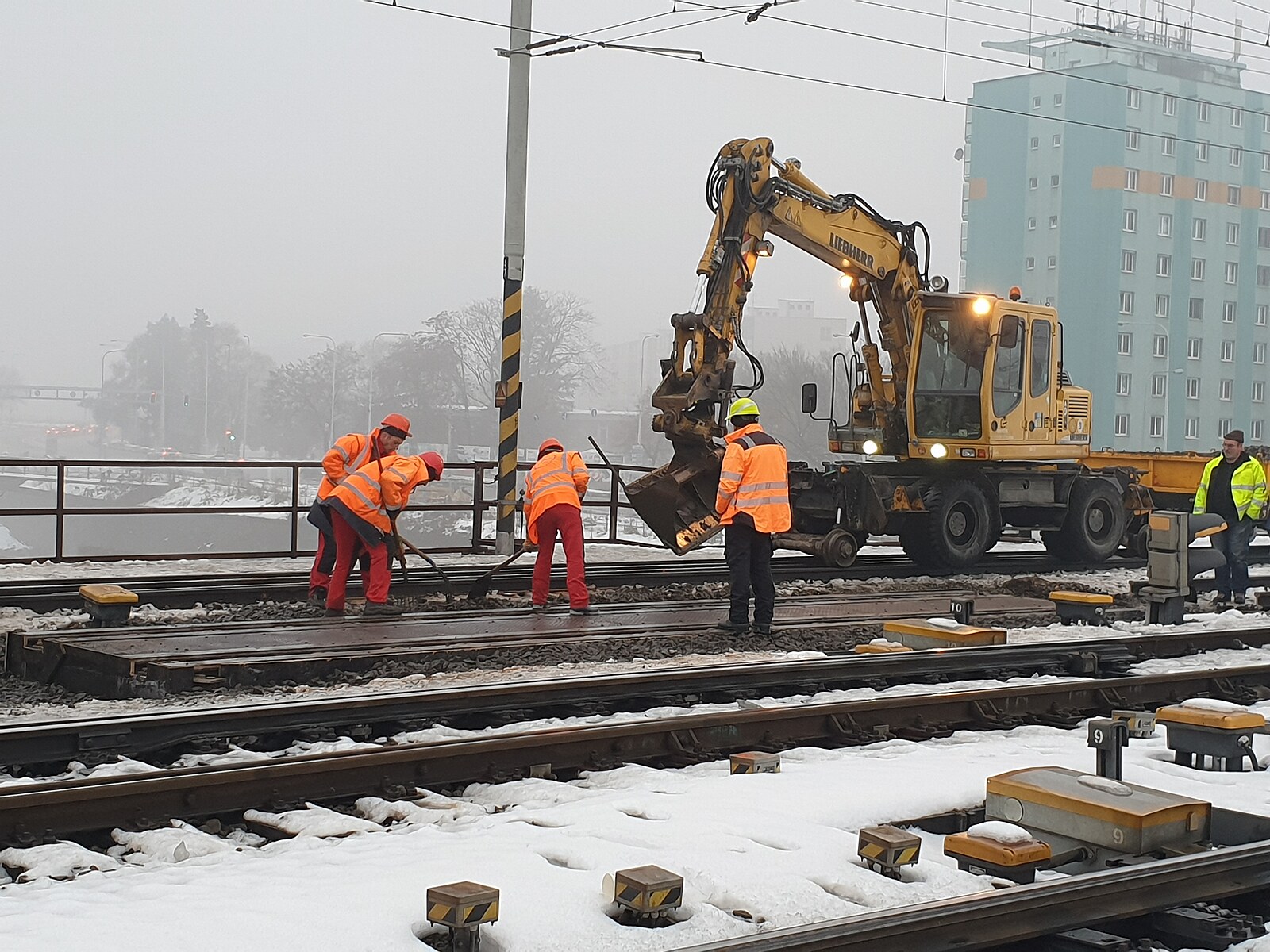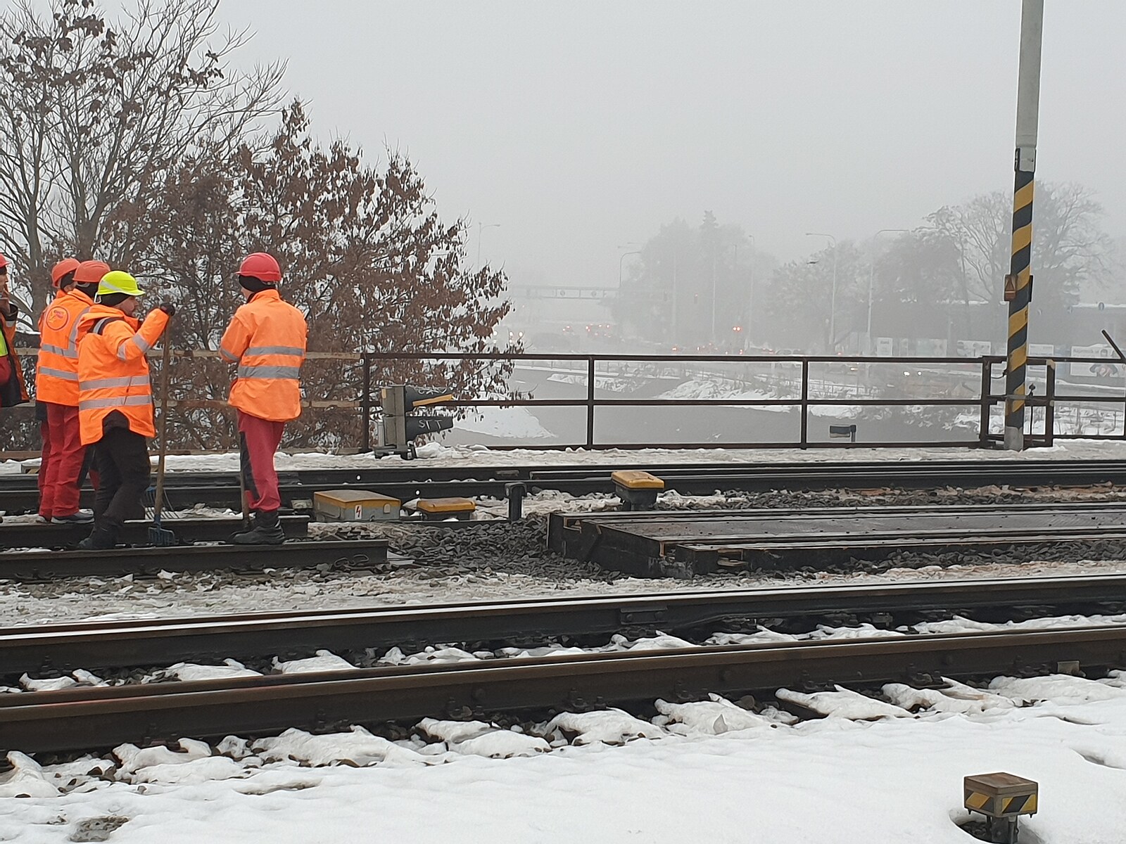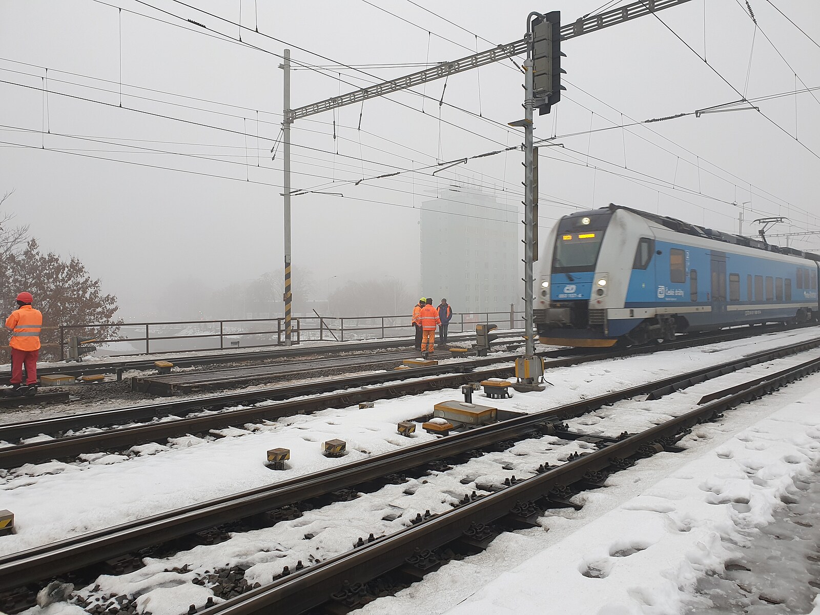 Poškozený železniční most v Brně, na němž dělníci usilovně pracují. (23. prosince 2022)