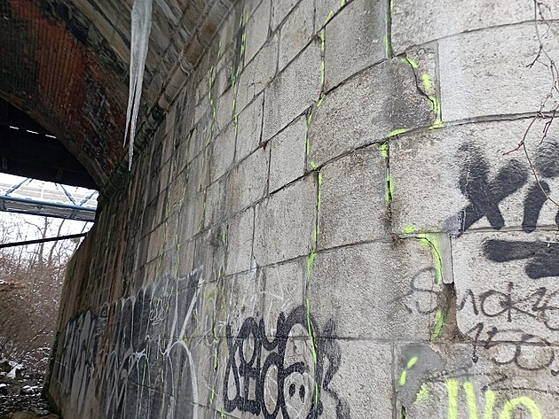 Poškozené pilíře železničního mostu nedaleko hlavního nádraží v Brně. V jeho blízkosti Brno buduje protipovodňová opatření.