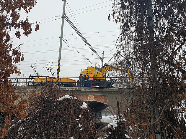 Dělníci pracují na poškozeném mostě, aby na něj mohli umístit provizorní konstrukci. Díky ní tudy opět pojedou vlaky. (23.12.2022)