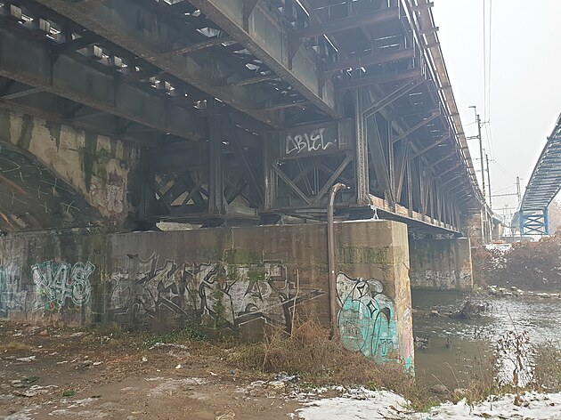 Poškozený železniční most v Brně, na němž dělníci usilovně pracují. (23.12.2022)